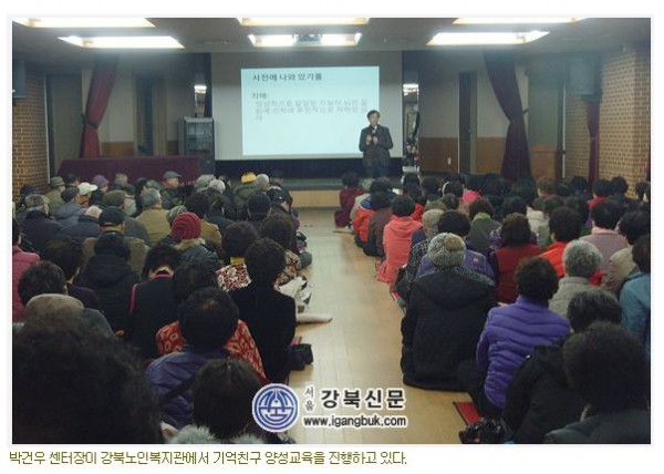 강북구 치매지원센터에서는 시립 강북노인종합복지관과 업무협약(MOU)을 체결하고, 노인 사회활동 지원사업 참여자를 대상으로 3월13일에 이어 4월3일 강북구치매지원센터장인 박건우 교수(고대 안암병원 신경과)의 강의로 기억친구 양성교육을 진행한다. 치매는 암보다 더 흔한 질병으로 85세 이상에서는 1/3이 치매이며 치매는 더 이상 남의 일이 아니다. 나 자신, 내 가족, 내 이웃 그리고 우리 모두의 일이다. 천만 서울시민 기억친구 프로젝트란 치매걱정 없는 대한민국 만들기 릴레이 캠페인으로 서울시 및 자치구 치매지원센터가 펼치는 인식개선 캠페인이다. 치매에 대한 불안을 감소시키며 올바른 지식을 가지고, 지역사회에서 치매환자와 가족이 안심하고 생활 할 수 있도록 치매인식개선과 사회돌봄문화 확산을 위한 기억친구 및 리더를 양성하여 활동하는 것을 말한다. 기억친구가 되는 방법은 치매 걱정 없는 서울시 만들기에 동참하는 건강한 마음을 가진 대한민국 사람이면 누구나 가능하며, 치매와 관련한 일정시간의 교육을 받으면 기억친구가 될 수 있다. 앞으로 기억친구들은 치매 gate keeper로써 치매인식 개선사업과 사회 돌봄의 역할을 할 것이며 이것을 기반으로 지역사회 지지체제 네트워크를 구축하여 치매환자나 가족, 내 이웃이 ‘치매 안심 강북’이 될 수 있도록 활동할 예정이다. | ||