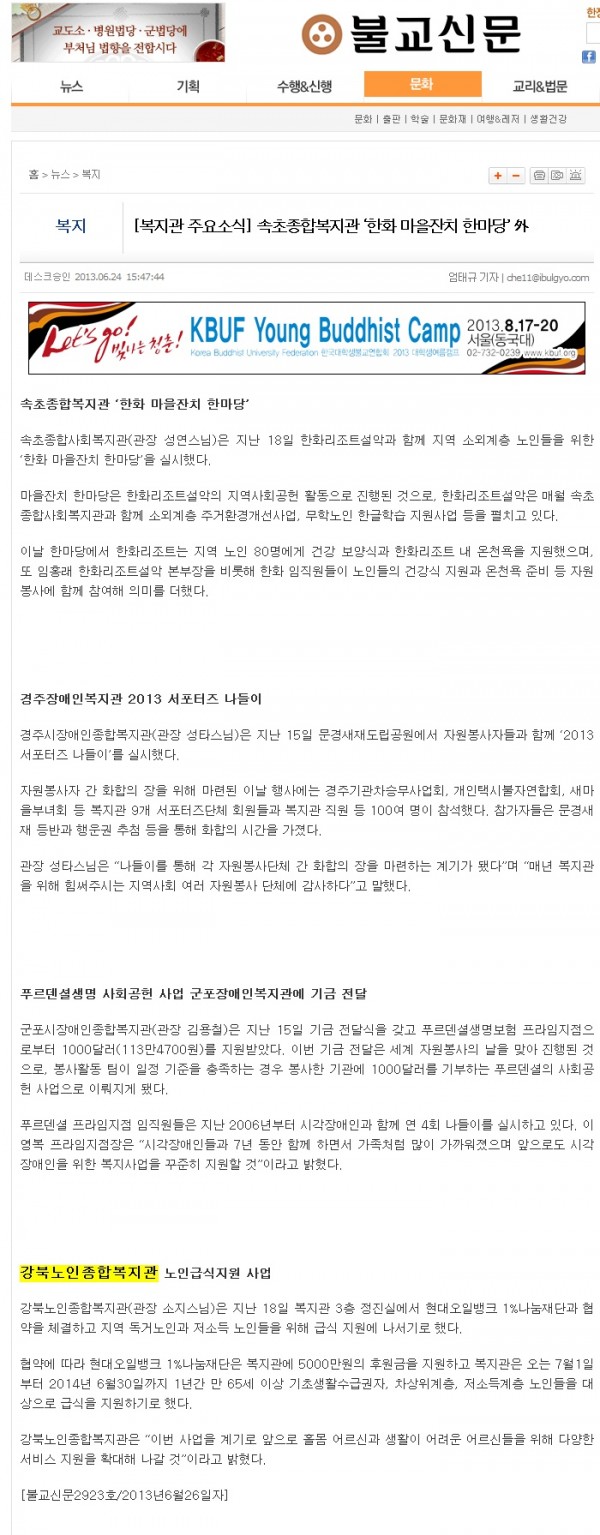 [2013.6.24] 불교신문 - 강북노인종합복지관 노인급식지원 사업