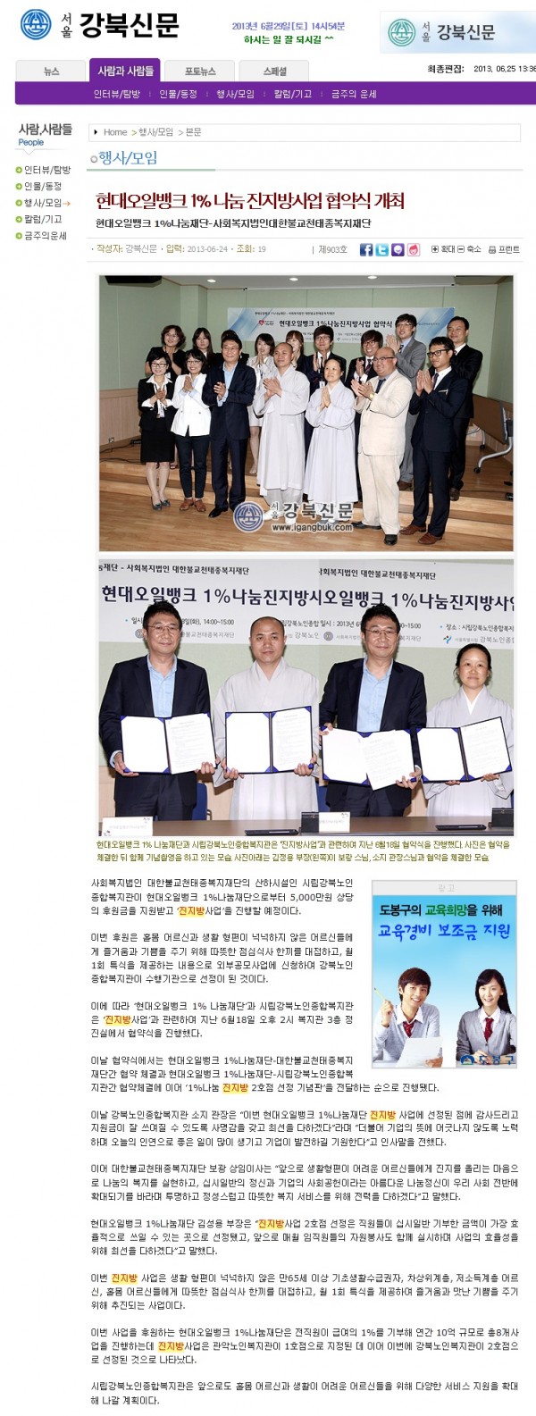 [2013.6.24] 강북신문 - 현대오일뱅크 1%나눔 진지방사업 협약식 개최