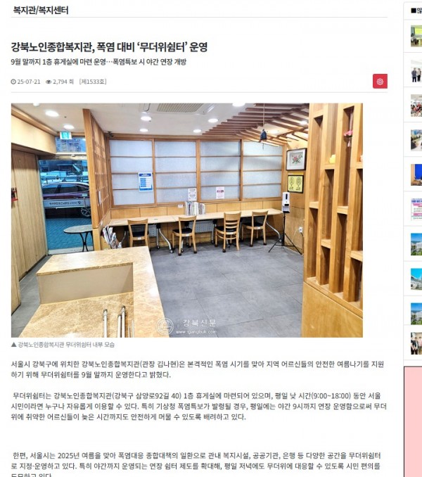 [2025.07.21] 강북노인종합복지관, 폭염 대비 ‘무더위쉼터’ 운영 - 서울강북신문