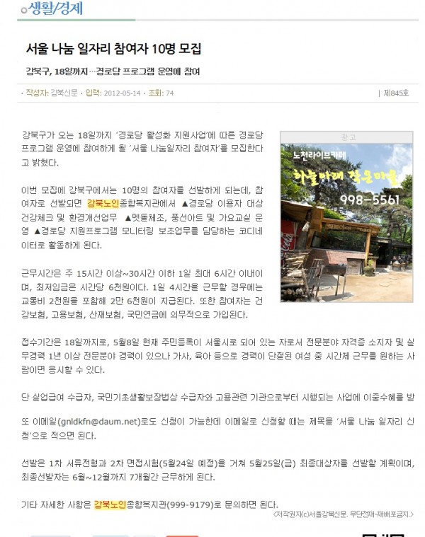 [2012.5.14]강북신문 - 서울 나눔 일자리 참여자 10명 모집
