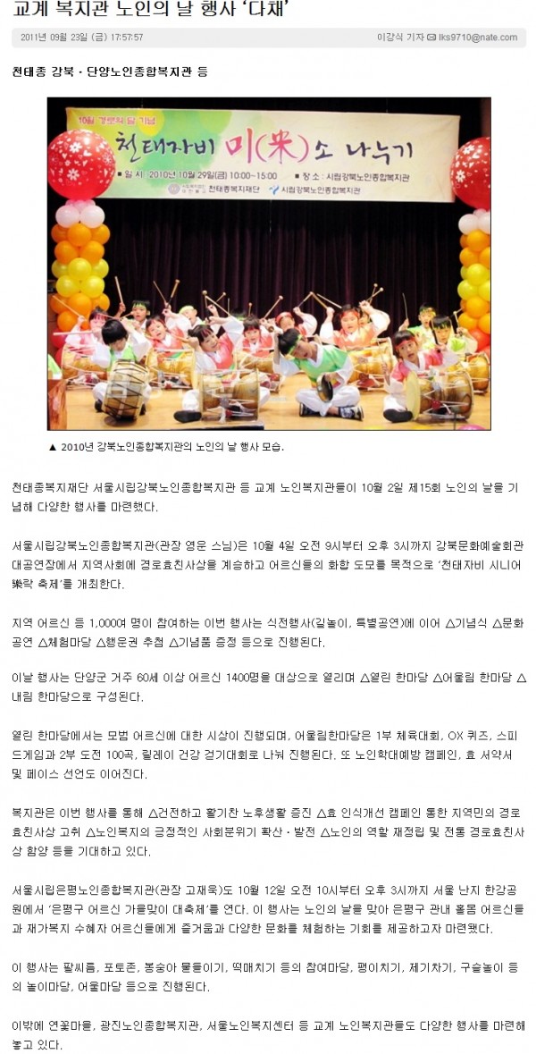 <DIV>시립강북노인종합복지관에서는 지난 9월 23일(금) <STRONG>노인의 날 행사와 </STRONG>관련하여 금강신문에 보도되었습니다</DIV></BODY></HTML>