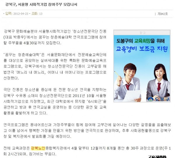 [2012.4.23]강북신문 - 강북구, 서울형 사회적기업 참여주부 모집나서