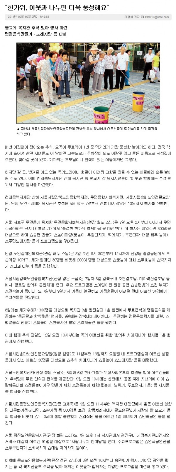 <DIV>시립강북노인종합복지관에서는 지난 9월 2일(금) <STRONG>한가위 행사</STRONG>와<STRONG> </STRONG>관련하여 금강신문에 보도되었습니다</DIV></BODY></HTML>