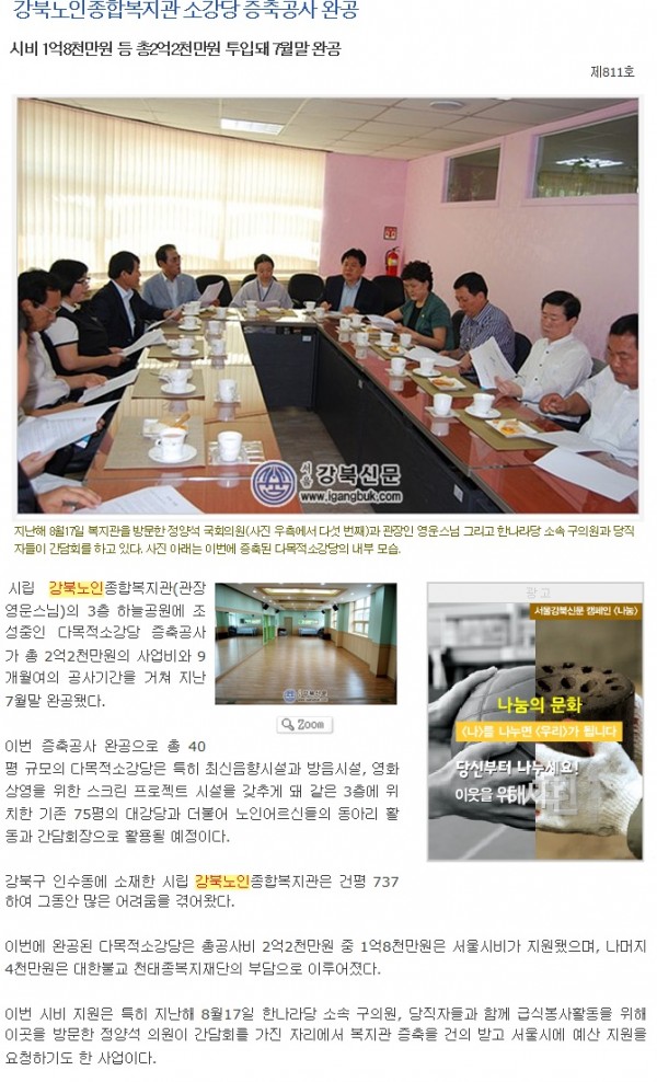 <DIV>시립강북노인종합복지관에서는 지난 9월 19일(월) <STRONG>소강당 증축공사 완공과</STRONG><STRONG> </STRONG>관련하여 강북신문에 보도되었습니다</DIV></BODY></HTML>