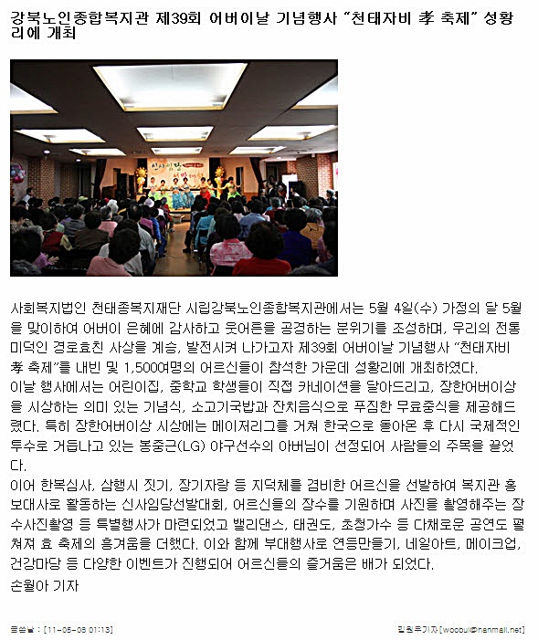 <DIV>시립강북노인종합복지관에서는 지난 5월 4일 어버이날행사 '천태자비 효 축제'가 진행되었으며, 이에 대한 자료가 보도되었습니다. </DIV></BODY></HTML>