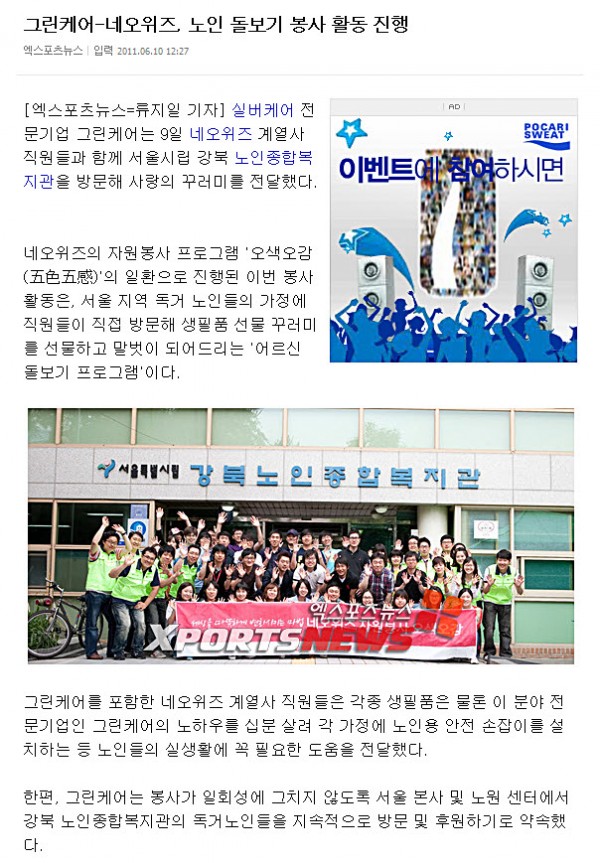 [2011.6.10] 다음 엑스포츠뉴스 - 그린케어, 네오위즈 노인 돌보기 봉사 활동 진행