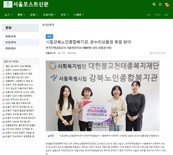 [2025.05.28] 시립강북노인종합복지관, 온누리상품권 후원 받아 - 서울포스트신문