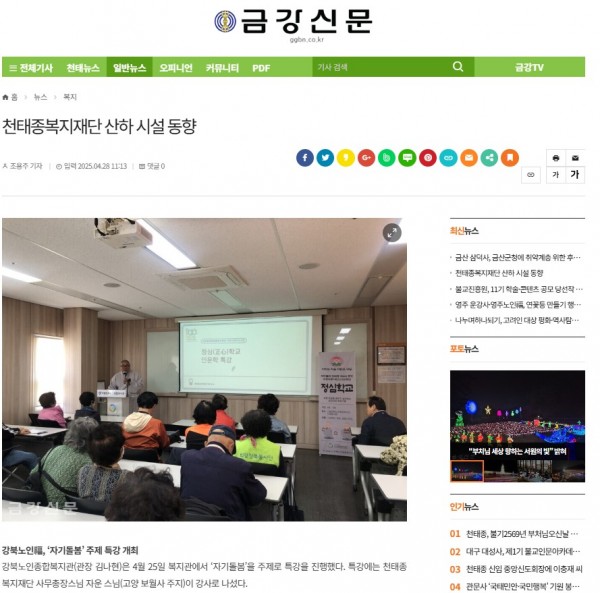[2025.04.28] 천태종복지재단 산하 시설 동향 '강북노인福, 자기돌봄 주제 특강 개최' - 금강신문