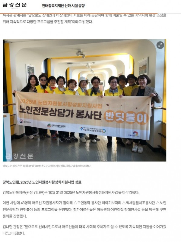 [2025.11.07] 천태종복지재단 산하 시설 동향 '강북노인福, 2025년 노인자원봉사활성화지원사업 성료'- 금강신문