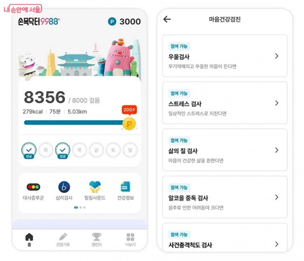 서울시는 시민들이 손쉽게 마음건강을 점검할 수 있도록 모바일 앱 ‘손목닥터9988’( 안드로이드 / 앱스토어 ) 마음건강검진과 온라인 플랫폼 ‘블루터치’ 정신건강검진을 상시 운영하고 있다.