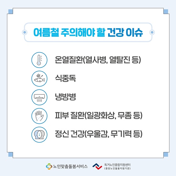 뜨거운 여름, 야외 활동이 잦은 노인맞춤돌봄서비스 종사자와 이용자의 건강한 여름을 위해 함께 알아보아요!