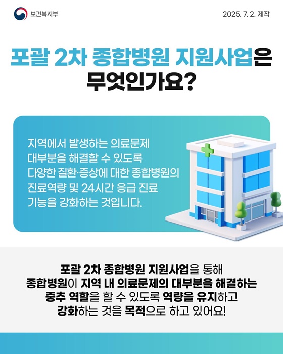포괄 2차 종합병원 지원사업을 통해 종합병원이 지역 내 의료문제의 대부분을 해결하는 중추 역할을 할 수 있도록 역량을 유지하고 강화하는 것을 목적으로 하고 있어요!