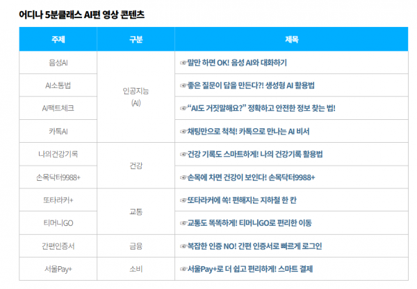 10종의 영상은 ▲생성형 AI 활용법 ▲AI 팩트체크 ▲음성 AI ▲카카오톡 AI ▲간편인증서 발급 ▲서울PAY ▲티머니Go 등 시니어층이 일상 생활에서 경험하는 디지털 상황을 반영했다. 한국언론진흥재단, 서울교통공사, 한국보건의료정보원 등 분야별 전문기관과의 협력을 통해 제작하여 콘텐츠의 전문성을 높인 동시에 쉬운 설명과 생활사례를 중심으로 구성해 누구나 따라 할 수 있도록 지원한다.