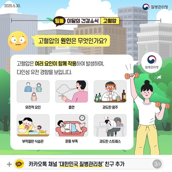 고혈압에 대한 더 자세한 내용은 질병관리청 누리집, 매달 새로운 건강 지식을 알려주는 이달의 건강소식은 카카오톡 채널 '대한민국 질병관리청'을 추가하고 메시지로 받아보세요.