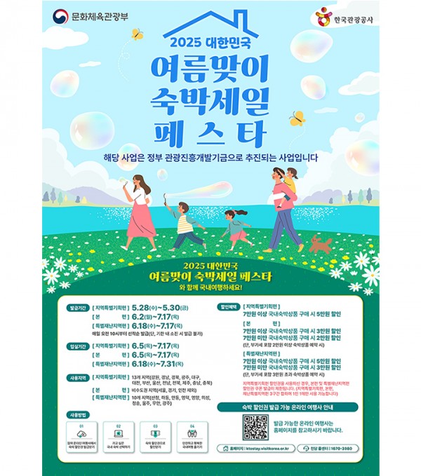 문화체육관광부는 한국관광공사와 함께 여름 휴가철에 앞서 국민의 국내 여행을 장려하고 지역경제에 활력을 불어넣기 위한 '2025 대한민국 여름맞이 숙박세일페스타' 행사를 28일부터 추진한다.