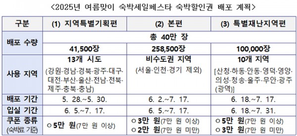이번 '숙박세일페스타'행사에서는 13개 광역 지자체와 함께하는 '지역 특별기획편'을 비롯해 비수도권 지역 숙박시설을 대상으로 하는 '본편', 산불 피해 및 12·29 여객기 참사 '특별재난지역편' 등 숙박할인권 총 40만 장을 배포한다.