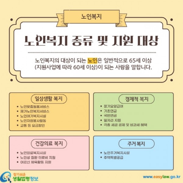 노인복지의 대상이 되는 “노인”은 일반적으로 65세 이상(지원사업에 따라 60세 이상)이되는 사람을 말합니다(보건복지부 『2024년 노인보건복지 사업안내(Ⅰ)』, 37쪽~38쪽 참조).