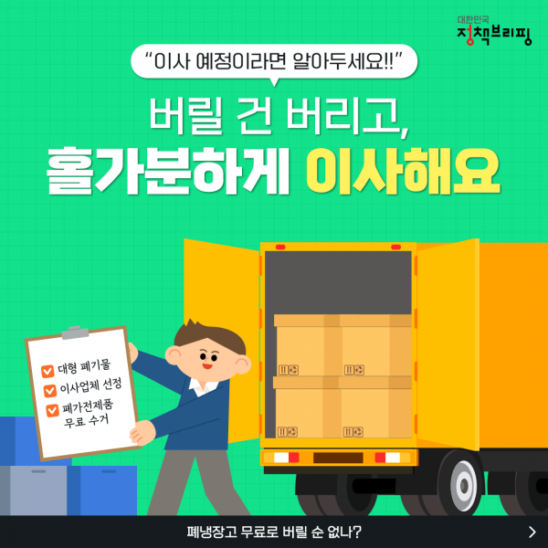 이사를 준비하고 계신가요? 이사를 앞두고 정리할 물건들이 있을텐데요. 크고 작은 가전·가구들 어떻게 처리해야 할까요? 크기·개수별 처리 방법에 대해 정리해봤습니다. 더불어, 소중한 물건을 옮겨줄 이사 업체가 국토교통부의 허가를 받은 곳인지 확인 받는 방법도 알려드릴게요. 다음 편엔 확정신고, 주택임대차신고 등 행정 처리 관련 소식을 가져오겠습니다.
