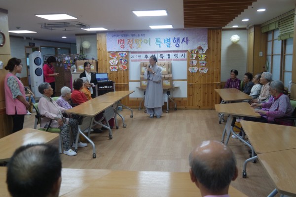 강북데이케어센터에서는 2019년 9월 명절 추석을 맞이하여 특별행사를 실시하였습니다. 본 행사는 센터장님 축하말씀을 시작으로 어르신 명절선물 증정, 민요 및 색소폰공연, 송편빚기, 투후놀이로 구성되었습니다.