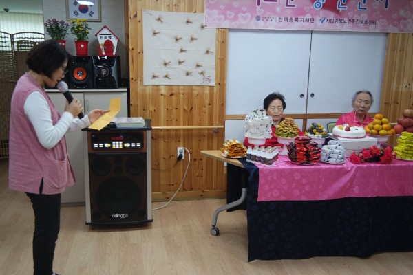 강북데이케어센터에서는 2018년 11월 ‘특별한 날의 행복’ 어르신 생신잔치을 실시하였습니다. 본 행사는 과장님 축하말씀을 시작으로 생신축하 노래 부르기, 선물증정식, 보호자에게 받은 손 편지 낭독, 직원들과 함께하는 즐거운 노래방 공연 순으로 진행하였습니다. 어르신들의 정서적지지 및 친밀감 향상을 도모하여 센터 이용의 즐거움을 제공하였습니다.