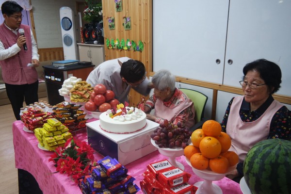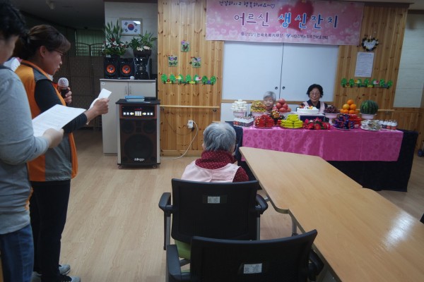 강북데이케어센터에서는 어르신들의 유대감 증진 및 즐거움 제공을 위하여 2018년 5월 어르신 생신잔치를 실시하였습니다. 본 행사는 센터장님 축하말씀을 시작으로 생신축하 노래 부르기, 선물증정식, 보호자에게 받은 손 편지 낭독, 즐거운 노래방강사, 직원들과 함께하는 여흥 순으로 진행하였습니다.