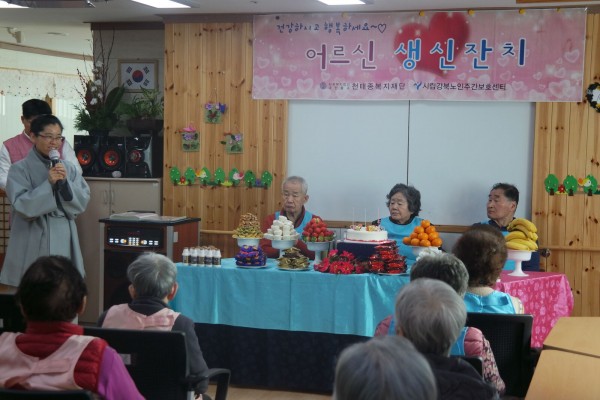 강북데이케어센터에서는 어르신들의 유대감 증진 및 즐거움 제공을 위하여 20181월 어르신 생신잔치를 실시하였습니다. 본 행사는 센터장님 축하말씀을 시작으로 생신축하 노래 부르기, 선물증정식, 보호자에게 받은 손 편지 낭독, 즐거운 노래방 강사님의 공연 순으로 진행하였습니다.