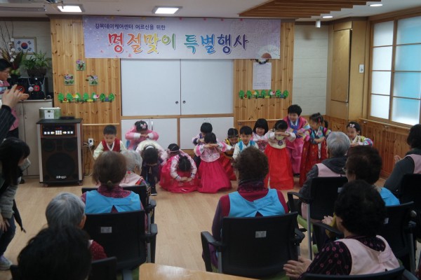 강북데이케어센터에서는 민족 고유의 명절 설을 맞이하여 센터 어르신들의 유대감 증진, 정서적 지지와 즐거움을 제공해 드리기 위하여 2018년 풍요로운 설맞이 대잔치 행사를 실시하였습니다. 본 행사는 복지관 부장님 축하말씀을 시작으로 강북구청 어린이집 7세반의 재롱잔치, 강북구 자원봉사센터 하하호호 웃음봉사단의 힐링댄스, 전통 춤 공연, 민요메들리 공연, 센터 직원일동 세배하기 순으로 진행하였습니다.