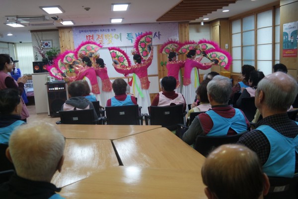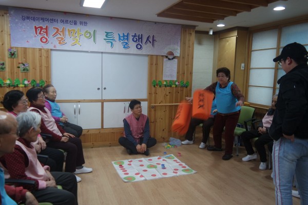 강북데이케어센터에서는 명절(정월대보름)맞이 특별행사를 실시하였습니다. 본 행사는 강북노인종합복지관에서 연계해준 희망강북봉사단 단원들의 한국무용 공연 및 어르신 팀 대전으로 전통놀이 ‘윷놀이’, ‘투호놀이’ 순으로 진행되었으며 센터 어르신들의 유대감 증진, 정서적 지지와 즐거움을 제공해 드림으로써 인지기능의 유지에 도움이 되는 시간이었습니다.