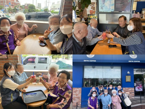 음료를 마시면서 카페 방문한 소감과 담소를 나누었습니다. (남자 어르신들은 '군대' 이야기를 주로 하였답니다)