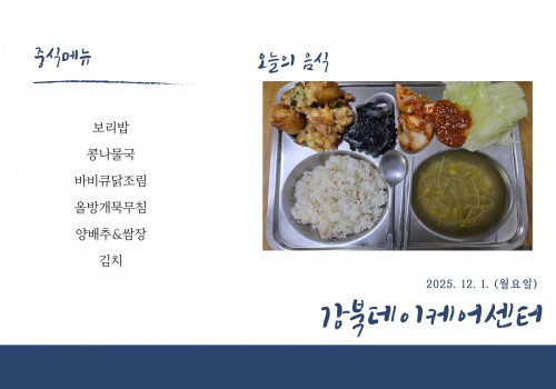 [데이케어] 2025년 12월 1일(월) 중식·간식·석식 식단
