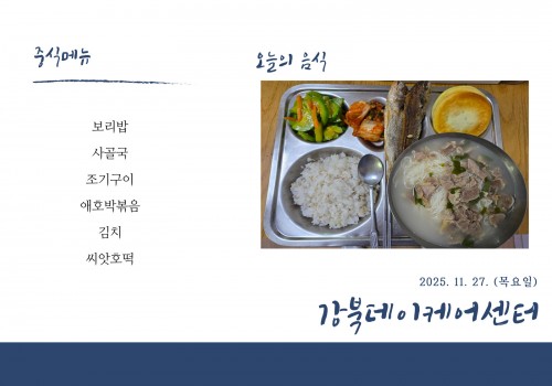 [데이케어] 2025년 11월 27일(목) 중식·간식·석식 식단
