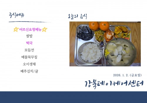[데이케어] 2026년 1월 2일(금) 중식·간식·석식 식단