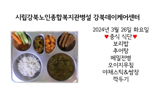 [데이케어] 2024년 3월 26일(화) 중식·간식·석식 식단