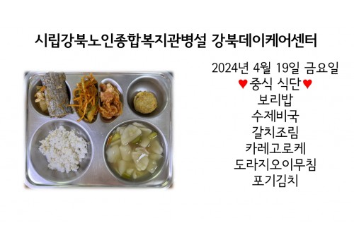 [데이케어] 2024년 4월 19일(금) 중식·간식·석식 식단