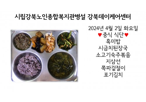 [데이케어] 2024년 4월 2일(화) 중식·간식·석식 식단
