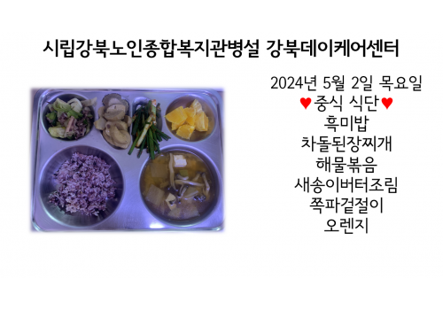 [데이케어] 2024년 5월 2일(목) 중식·간식·석식 식단