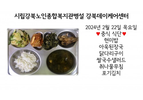 [데이케어] 2024년 2월 22일(목) 중식 식단