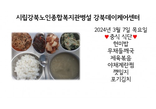 [데이케어] 2024년 3월 7일(목) 중식·간식·석식 식단