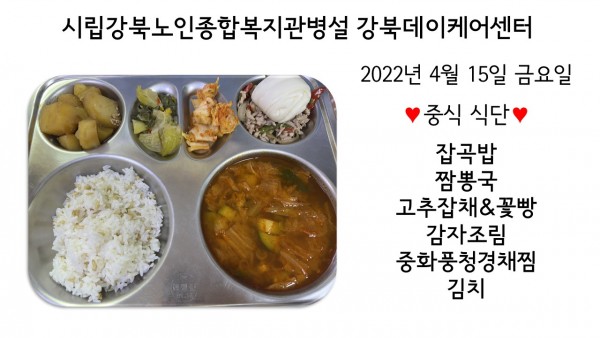 2022년 4월 15일(금) 중식 식단입니다. (클릭하면 사진을 더 크게 보실 수 있습니다.)