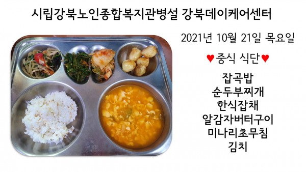 2021년 10월 21일(목) 중식 식단입니다. (클릭하면 사진을 더 크게 보실 수 있습니다.)