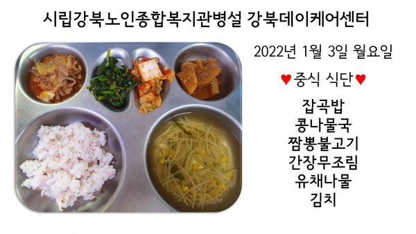 2022년 1월 3일(월) 중식 식단입니다. (클릭하면 사진을 더 크게 보실 수 있습니다.)