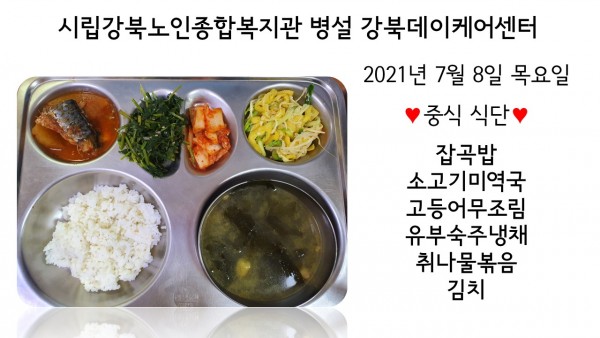 2021년 7월 8일(목) 중식 식단입니다. (클릭하면 사진을 더 크게 보실 수 있습니다.)