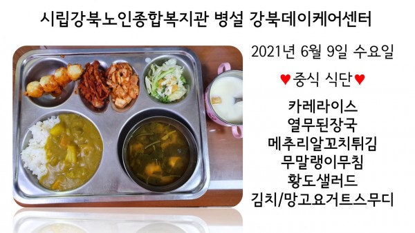 2021년 6월 9일(수) 중식 식단입니다. (클릭하면 사진을 더 크게 보실 수 있습니다.)
