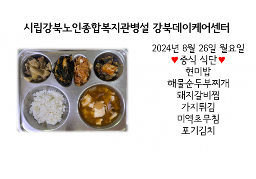 [데이케어] 2024년 8월 26일(월) 중식·간식·석식 식단