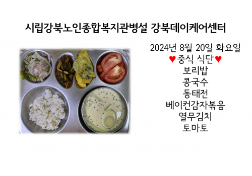 [데이케어] 2024년 8월 20일(화) 중식·간식·석식 식단