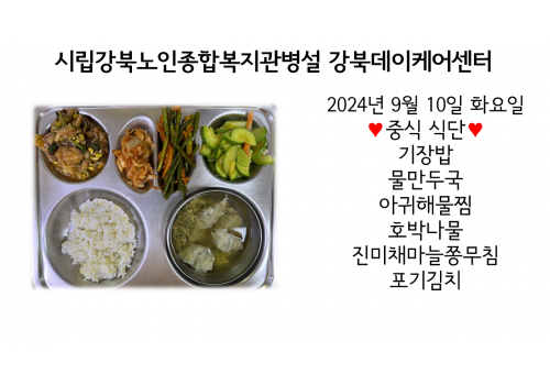[데이케어] 2024년 9월10일(화) 중식·간식·석식 식단
