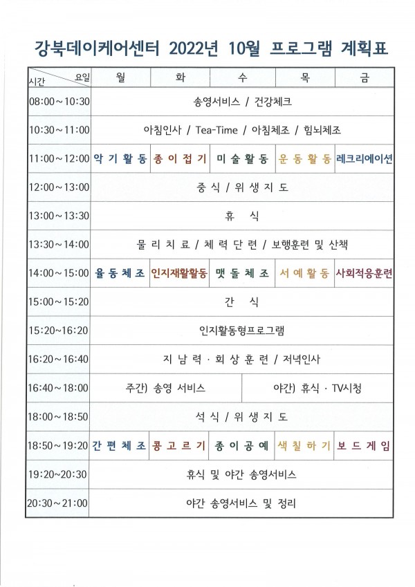 2022년 10월 강북데이케어센터 프로그램 계획표입니다.