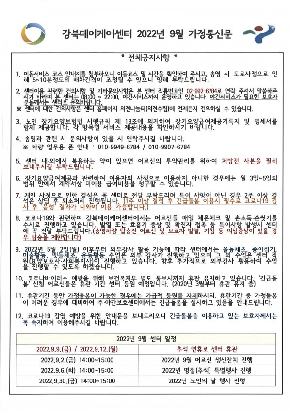 2022년 9월 강북데이케어센터 가정통신문입니다.
