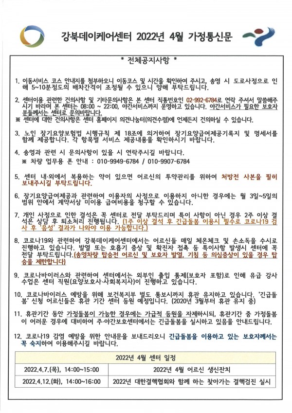 2022년 4월 강북데이케어센터 가정통신문입니다.